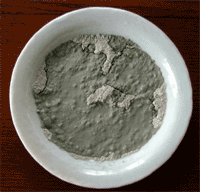 モンモリオナイトは、吸着力、膨潤力に優れている。スメクタイト族に分類されている。調べてみるとスメクタイトは、「汚れを取る」という語のラテン語smecticusから由来してつくられたそうだ。スメクタイト系粘土は、強い吸着性をもって、石けん代わりに使用されていたこともあったそうだ。カルシウム、マグネシウム、ミネラルを含んでいるとのこと。グリーンクレイよりも、薄い緑色をしている。また、膨潤(swelling)とは、固体物質が液体を取り込んで体積が増大する現象で、結晶の層間に水や有機溶媒などが入って底面間隔が広がる(膨張:expansion)ことが起因しているようだ。今回は、モンモリオナイト(大5)水(大5強)の割合とした。 |